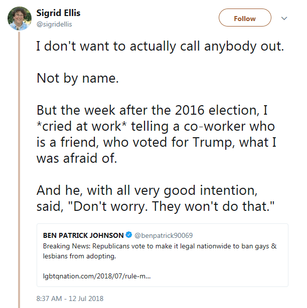 I offer my kindest prayers and condolences to those people in the military right now, for what this situation holds for you, for the people who were thinking of joining or have to join to pay for college or to make money that now have to stay closeted because now the united states military is limiting employment based upon how you identify and the part of the nation that protects the freedoms now is taking them away.